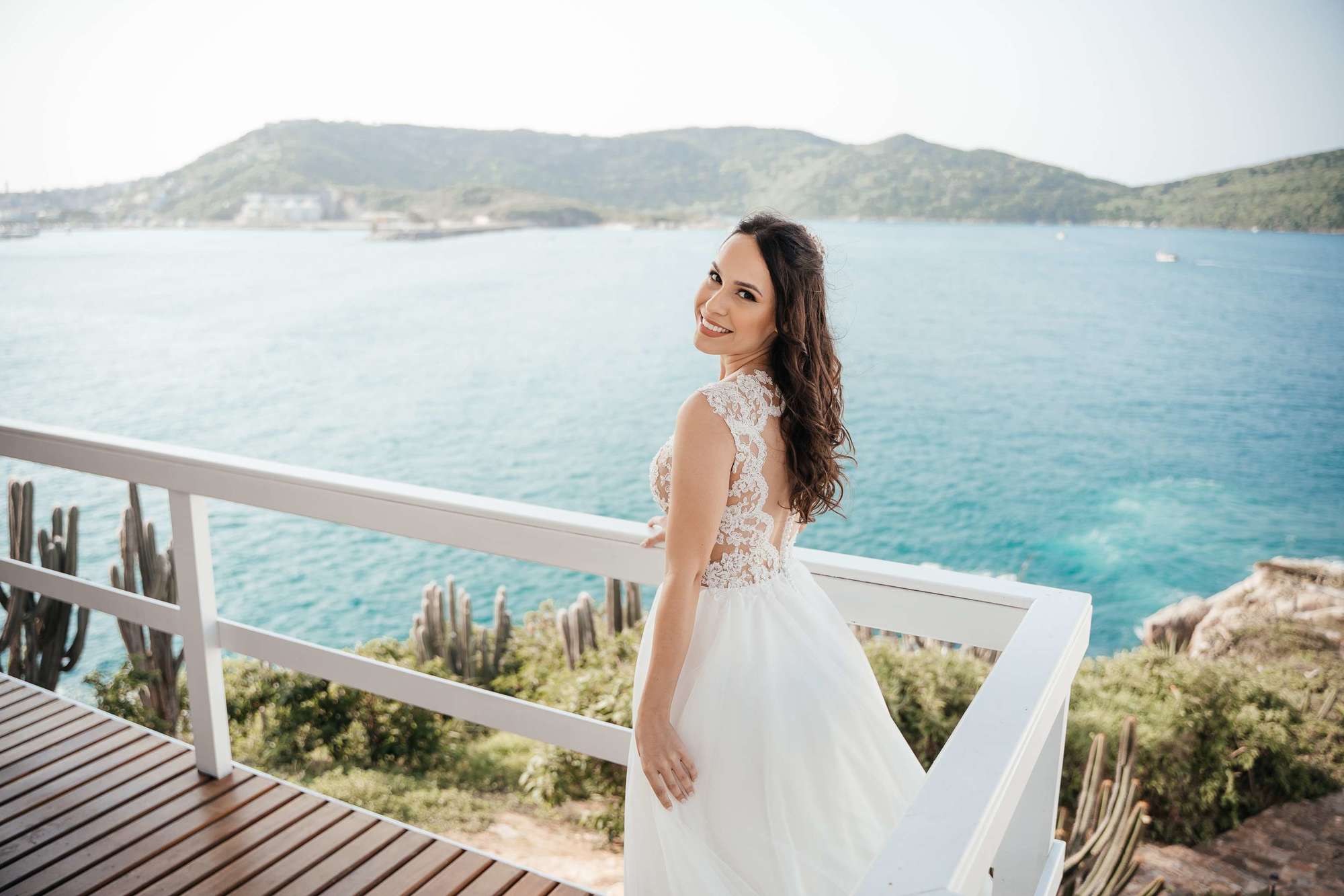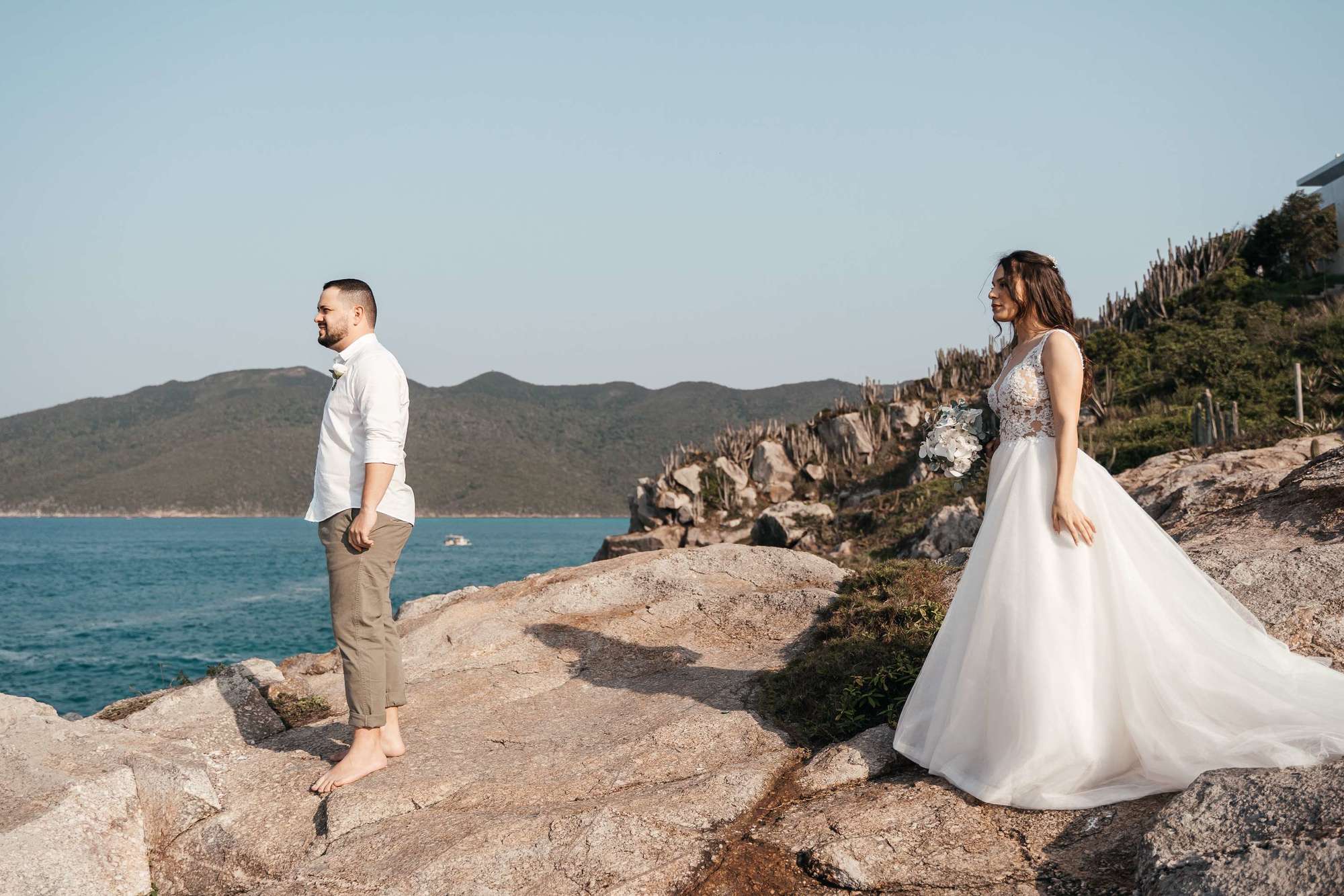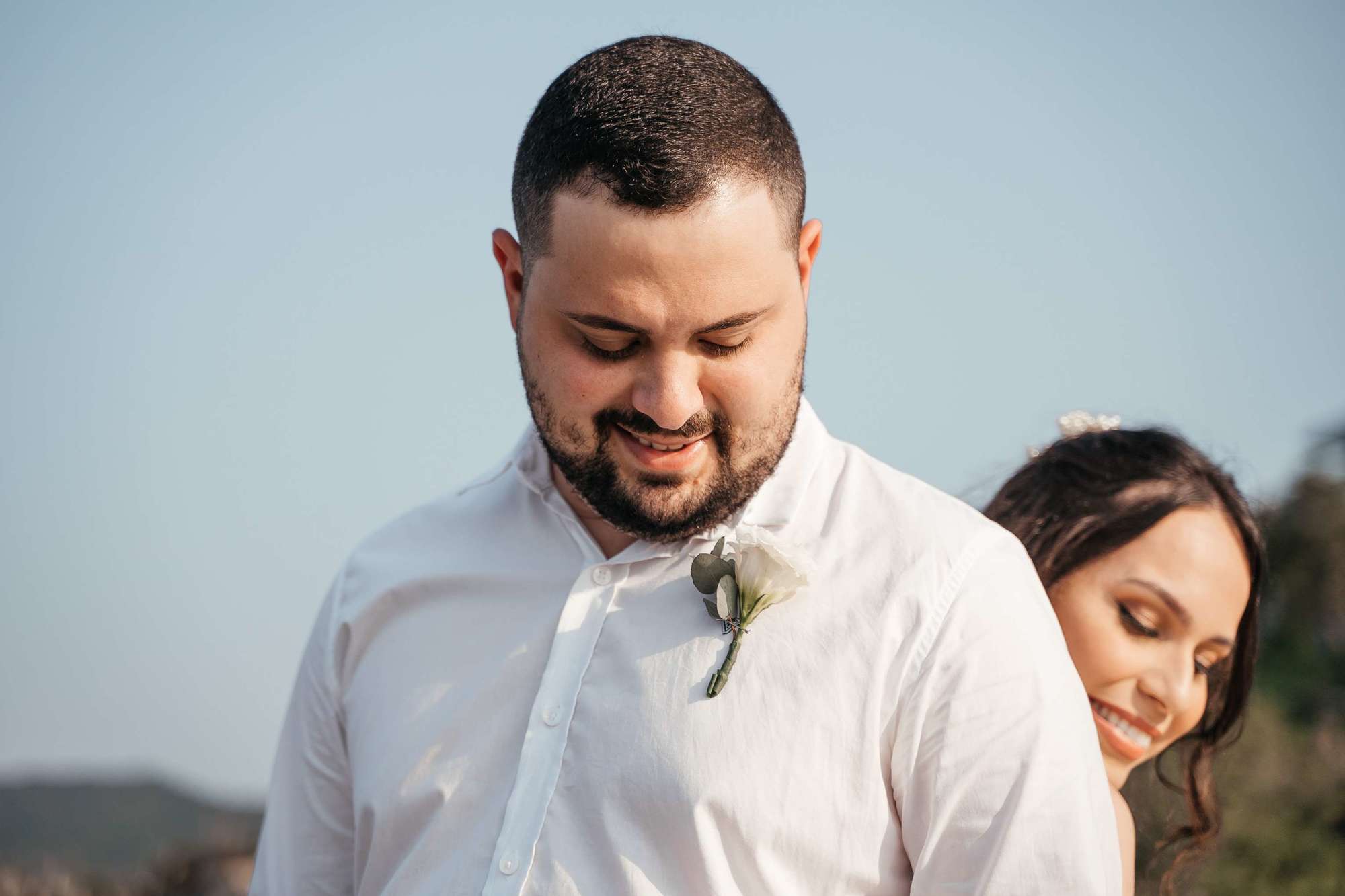 A noiva Cássia é maquiadora profissional e ela mesma se arrumou na uma bela casa que casal escolheu para sua viajem romântica em Arraial do Cabo. Eu ofereci fazer um "first look" antes de cerimonia e os noivos topam mas sem olhar um para outro - apenas dar um touque de mãos, sentir um de outro e energia do mar.